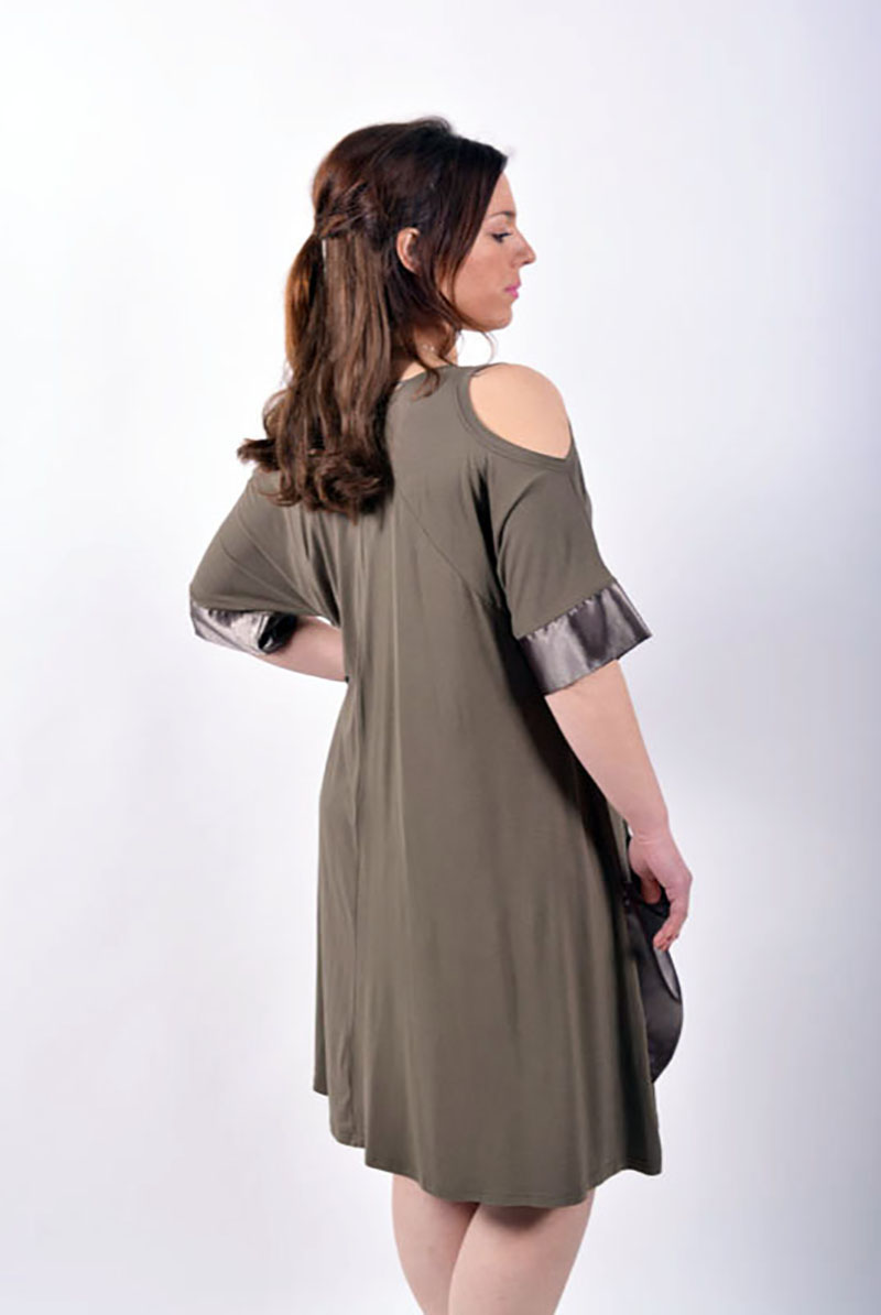 Φόρεμα βισκόζ ελαστικό με σατέν τσέπες και άνοιγμα στα μανίκια.