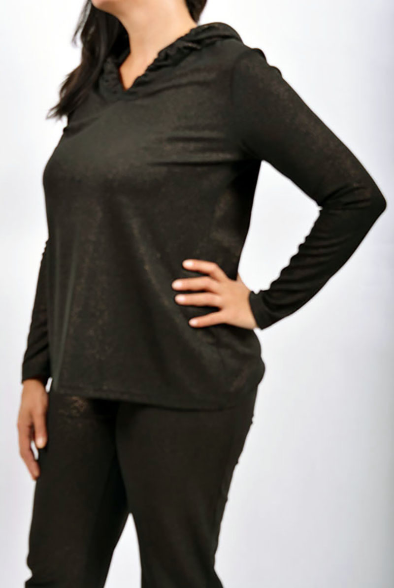 Μπλούζα από λαμέ ελαστικό ύφασμα με κουκούλα.
