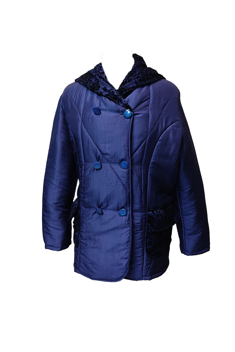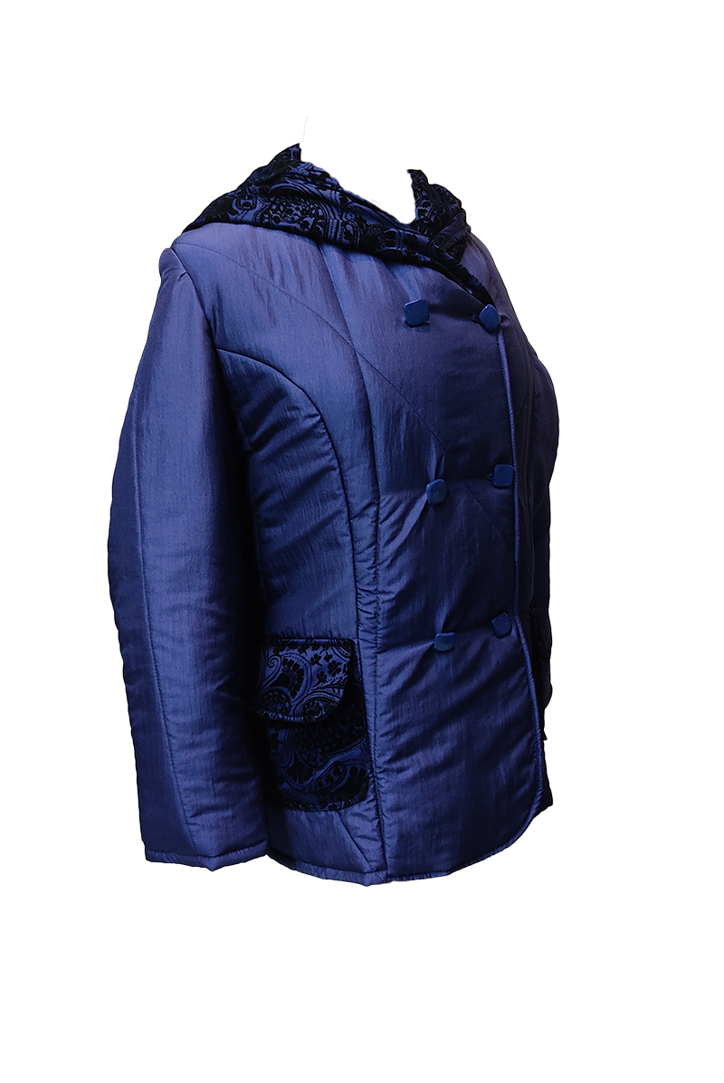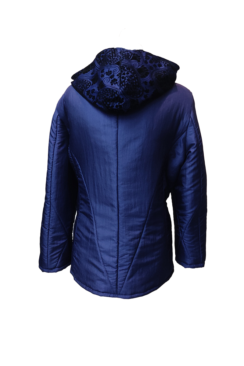 Μπουφάν από ύφασμα μπλέ,σταυρωτό με κουκούλα,φόδρα & επένδυση εσωτερικά.