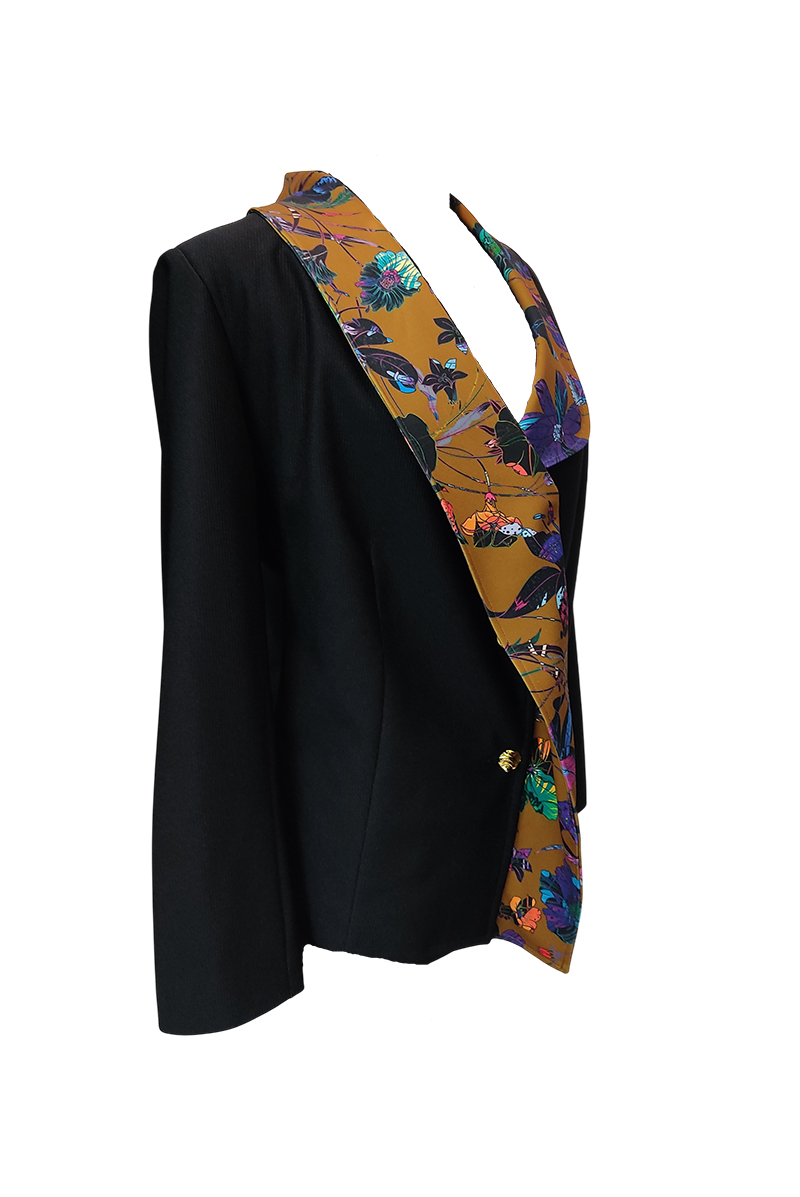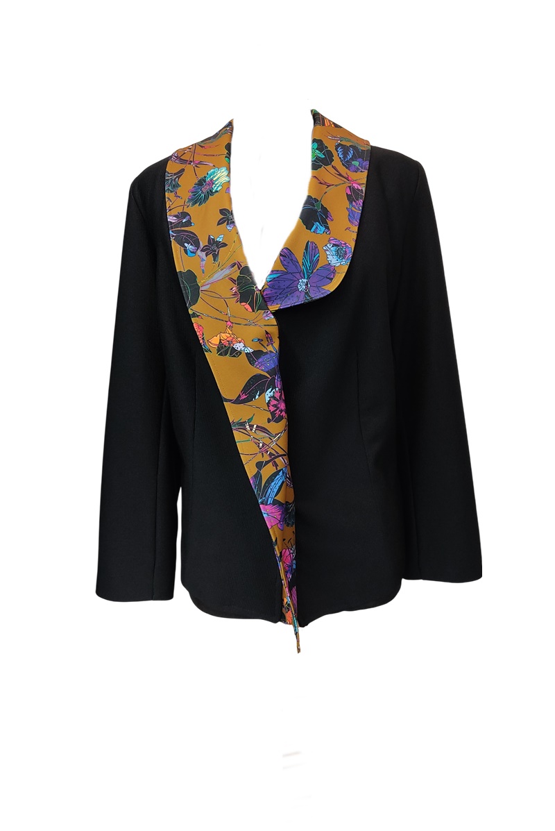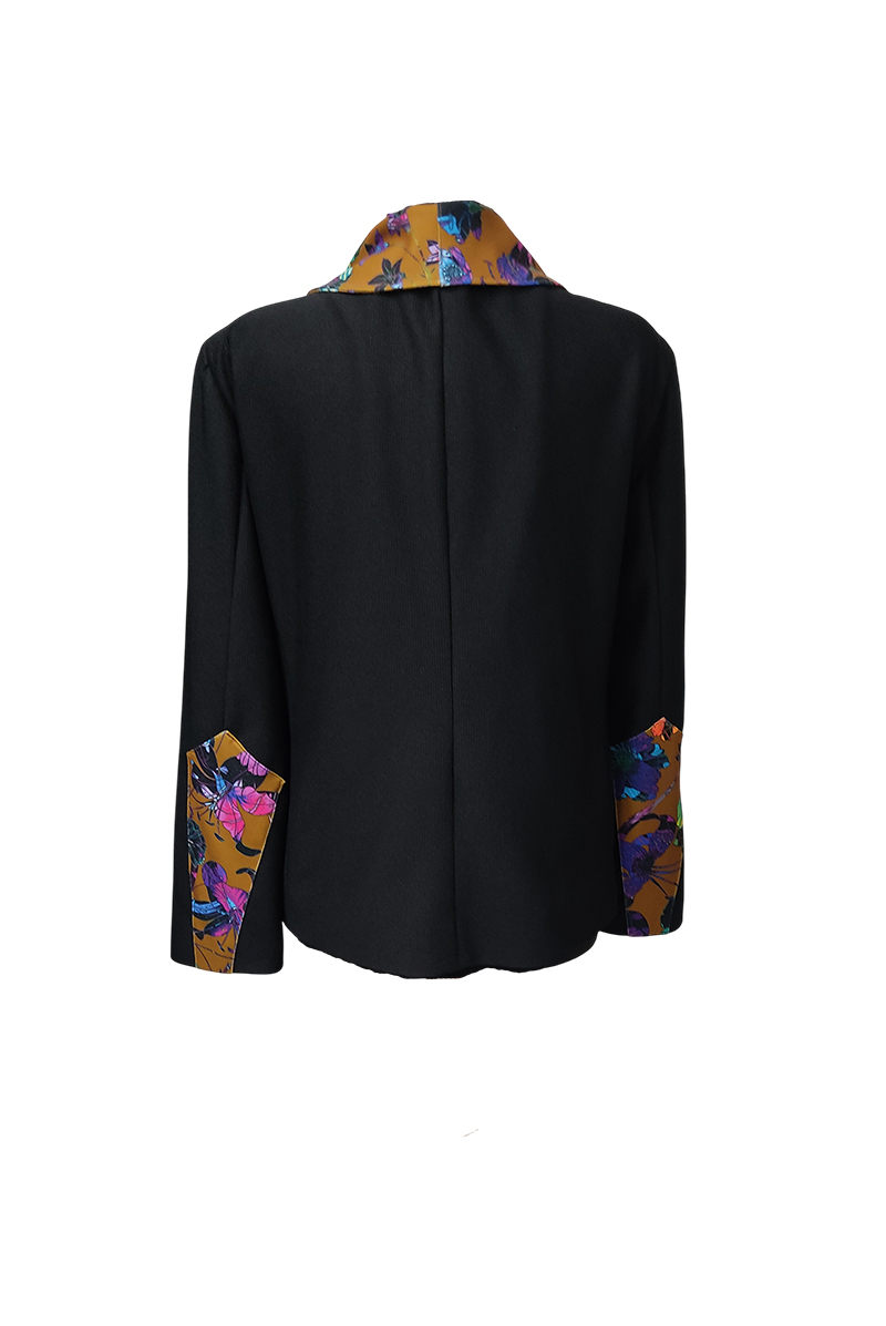 Σακάκι από ύφασμα κρέπ μαύρο,μόστρα από εμπριμέ ύφασμα,φόδρα εσωτερικά.